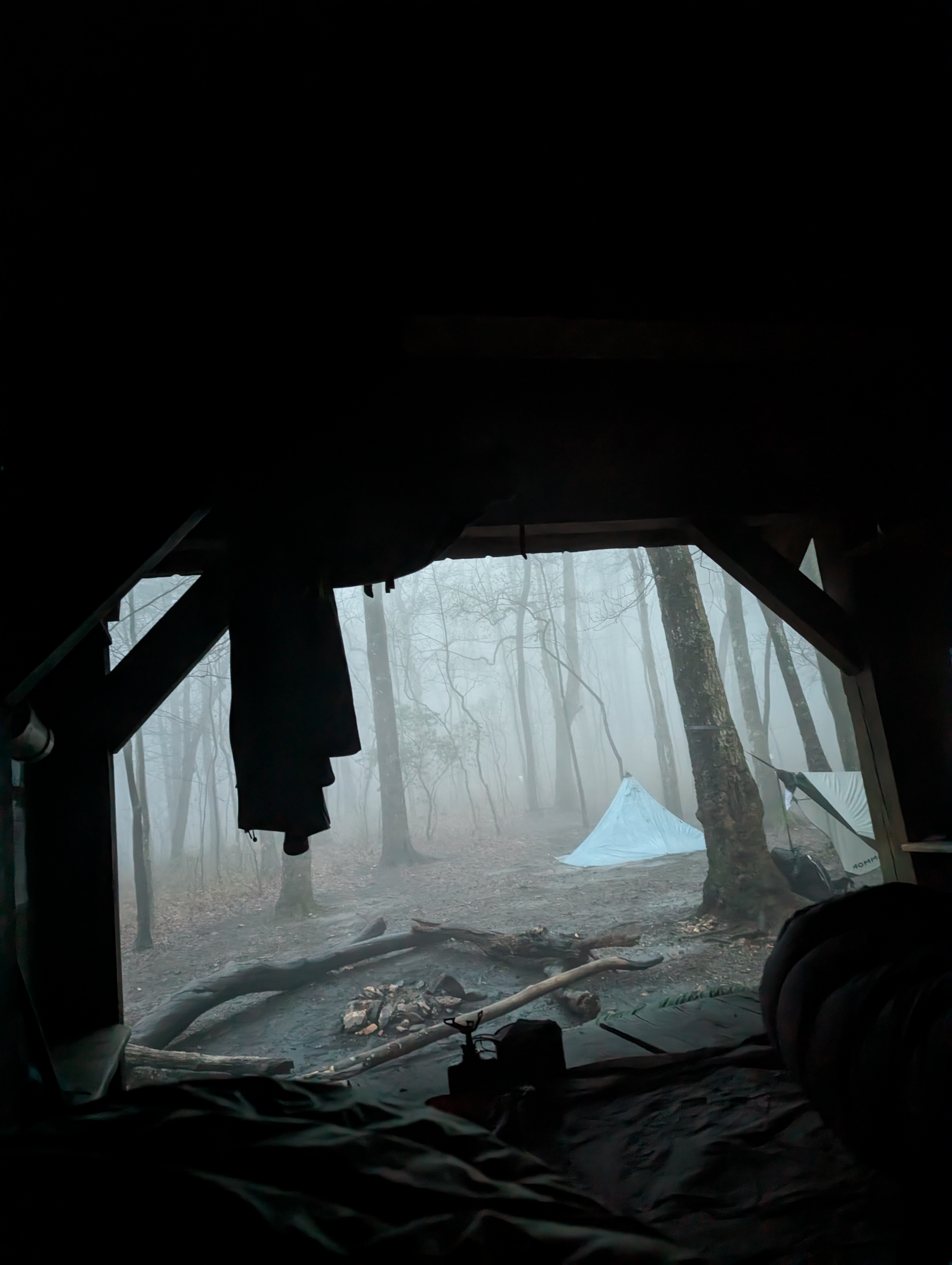 Woke up to a light drizzle and a foggy forest.