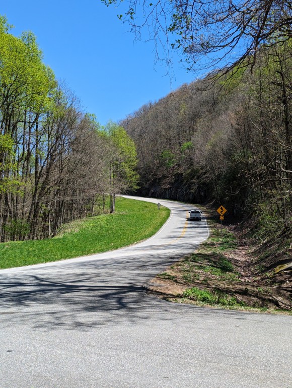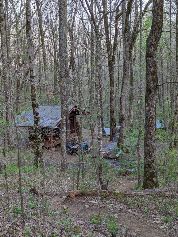 Staying at Low Gap Shelter tonight (tenting); many familiar faces here tonight. There are no bear boxes, so had to stash bear can in the forest for the first time.