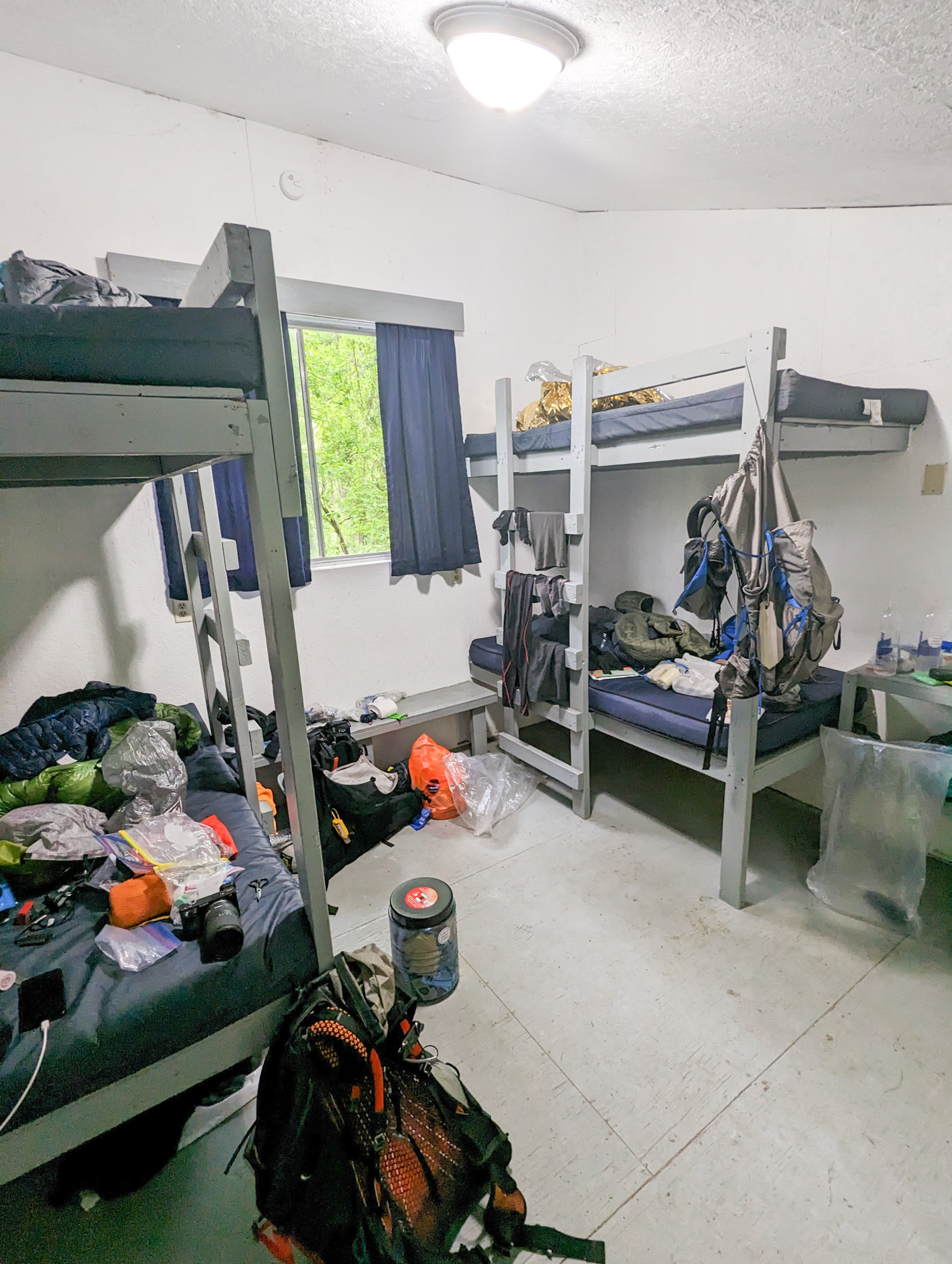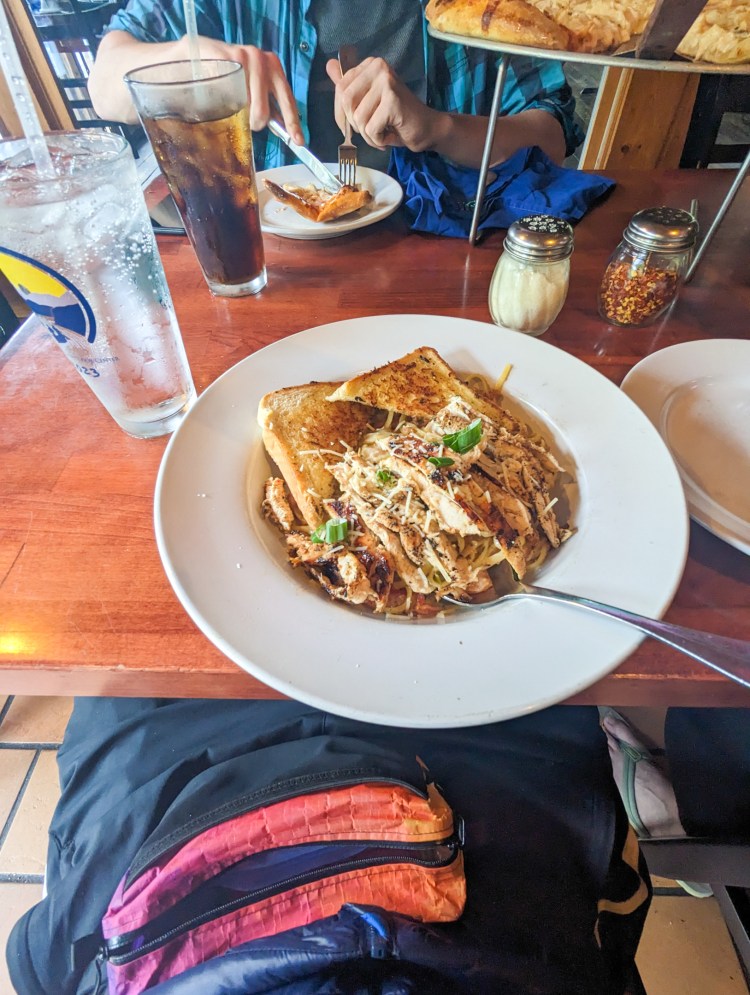 Checked into a cabin at the NOC. Amenities are Very Basic, but it’s warm and dry, so there’s that. Ate dinner at the on site restaurant: Chicken Alfredo Pasta (very yummy), and unlimited soda refills (yay USA).