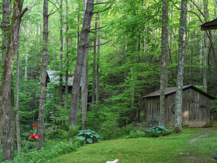 Afterwards a short hike with now unreasonably heavy packs to Cookie Ladies’, who has a cabin right in the forest off the AT. Neatest cabin I’ve ever seen. Nobody there, but cookies were there in a box, and clean water, wet wipes, and a trash can as well. Thanks Cookie Lady! Saw a hummingbird from Cookie Ladies porch.