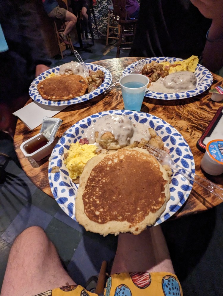 Got an excellent breakfast at The Station; pancake, potatoes, bacon, scone, gravy, coffee. Got a short shuttle drive from Dave back to trail.