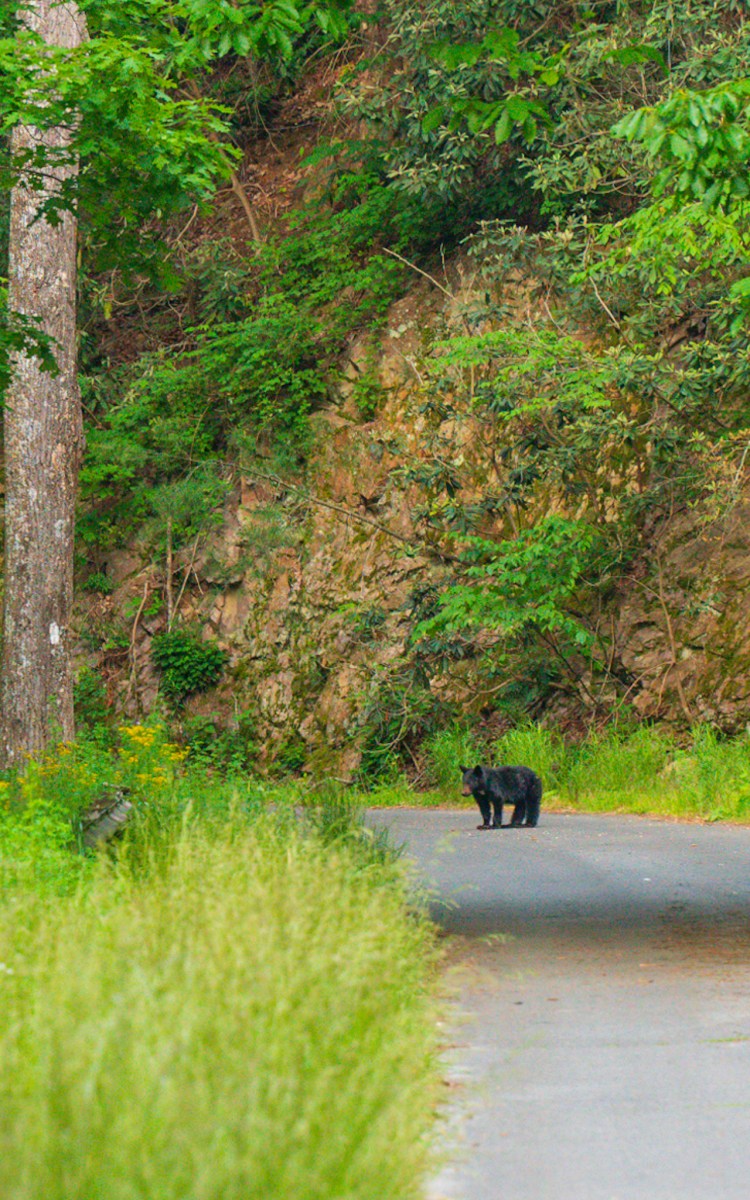 Saw two bear cubs on the road, who disappeared when we made loud noises.