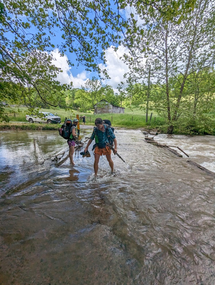 Did 20 miles, crossed an overflowing bridge, and forded a creek (bridge got washed out years ago). Wasn’t as bad as some people warned us, water barely got to our knees. Set up camp just on the other side.