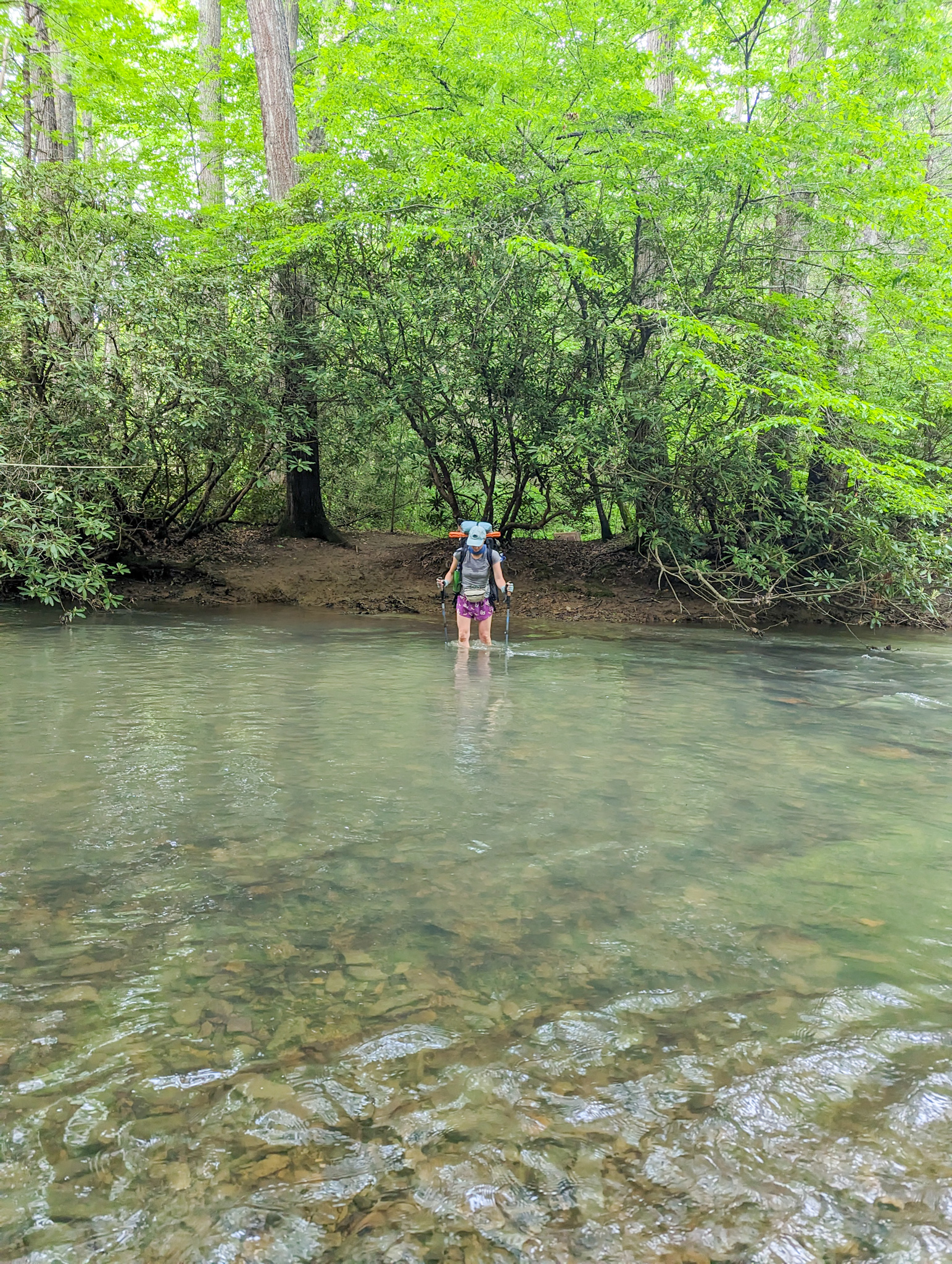 Did 20 miles, crossed an overflowing bridge, and forded a creek (bridge got washed out years ago). Wasn’t as bad as some people warned us, water barely got to our knees. Set up camp just on the other side.