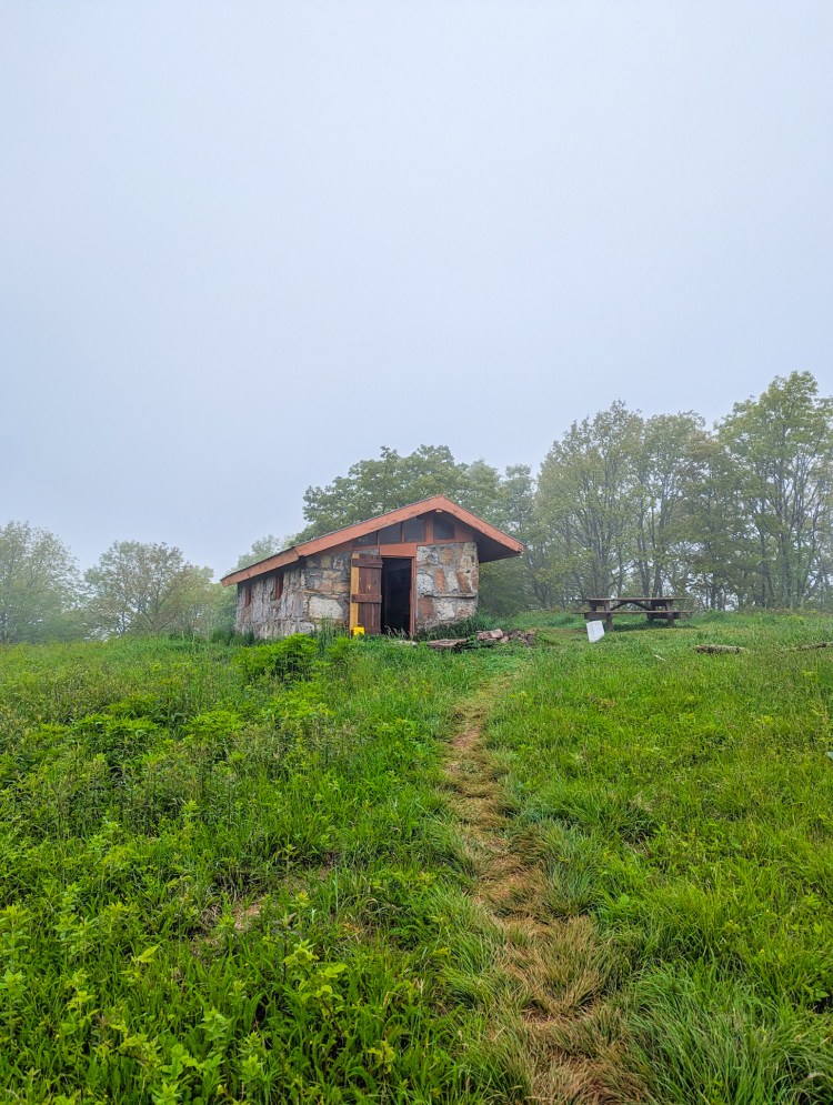 Broke down camp early and started the day with the climb up Chestnut Knob. Weather started out wet and foggy. The shelter up there is one of the sturdier ones, made completely out of stone and with a door to boot.