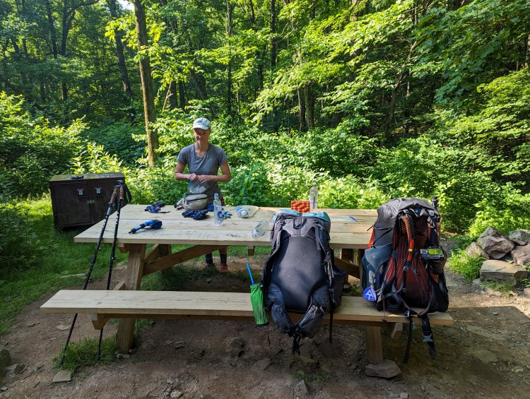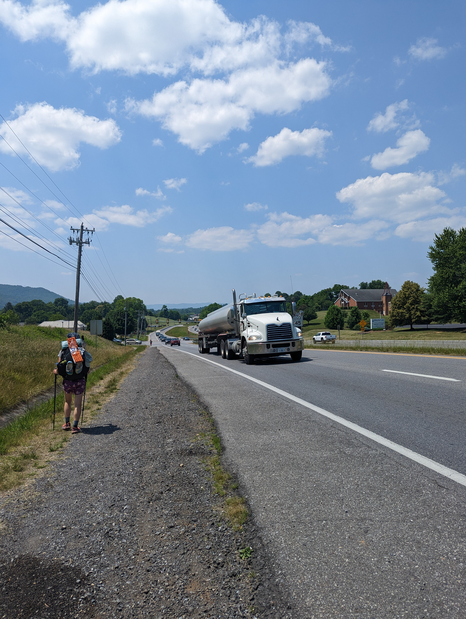 Came out of the woods at a highway, which was a little bit jarring. Short road walk to the outfitter, where Turmeric had a package waiting. Got a summer shirt there as well.