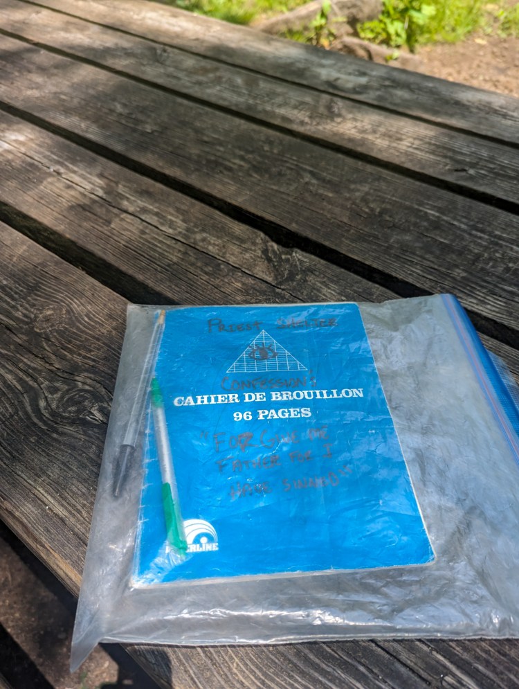 Today: A long descent, followed by a long ascent. Stopped by the Priest Shelter for lunch and a read of the confessions journal.