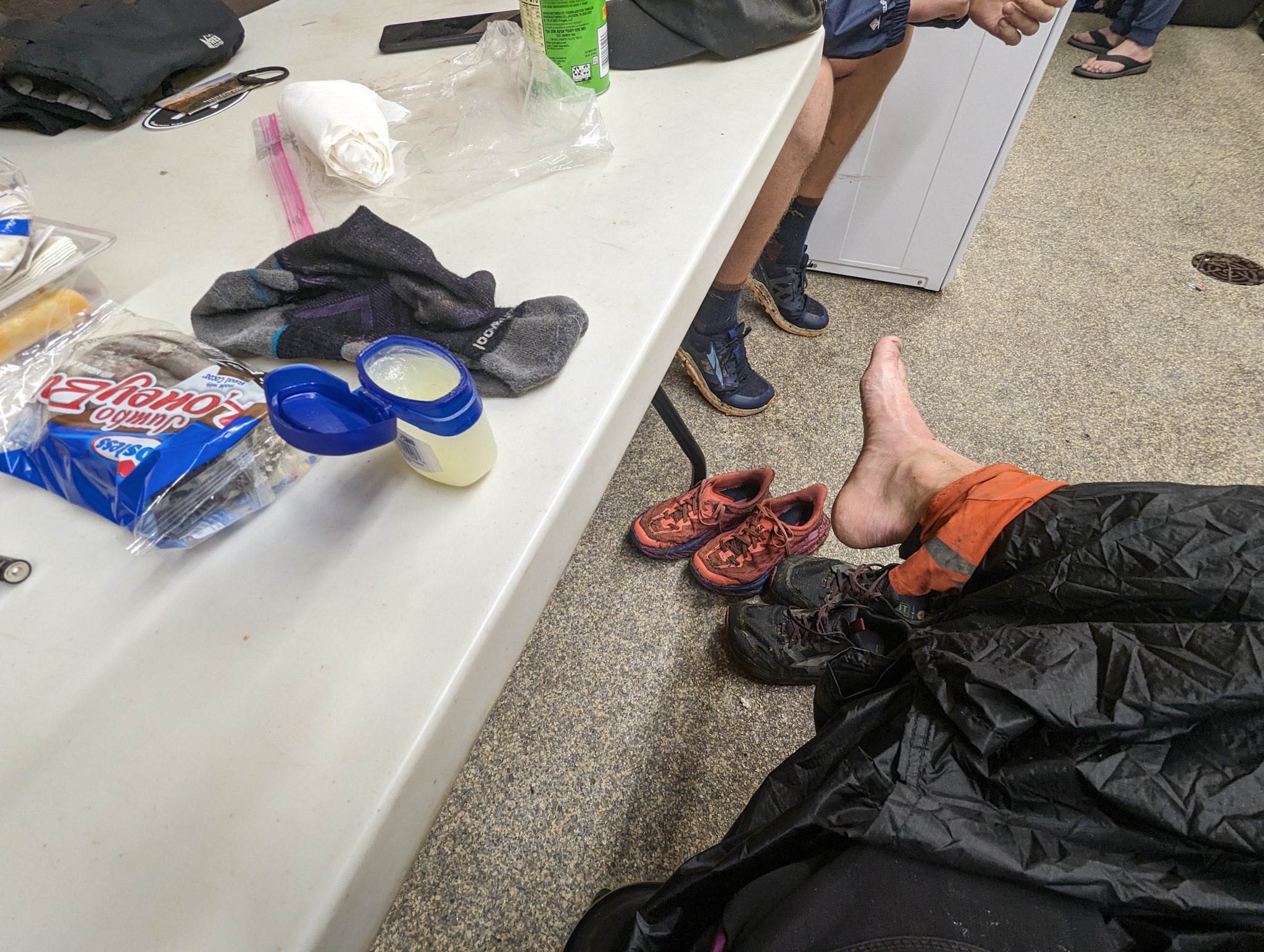 Started to slather our feet in Vaseline, which works remarkably well to manage wet feet. Reapplied that at the laundry room as well.