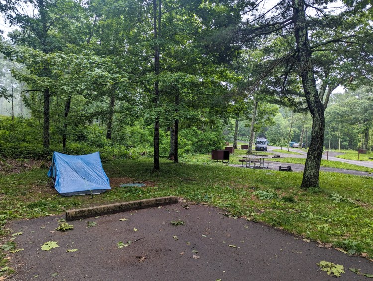 At the end of the day we got off trail and went to a campground to dump trash. The groundskeeper offered us a free tentsite, which we happily accepted. Flat ground, a personal bear box, warm water…