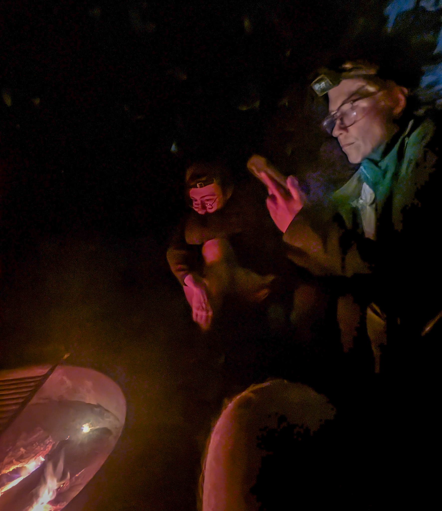 In the evening Buckeye picked us up again, went to a gas station for beer and hot dogs, which we grilled over a campfire back at the state park.