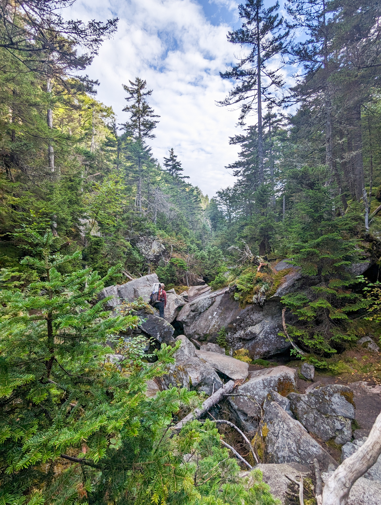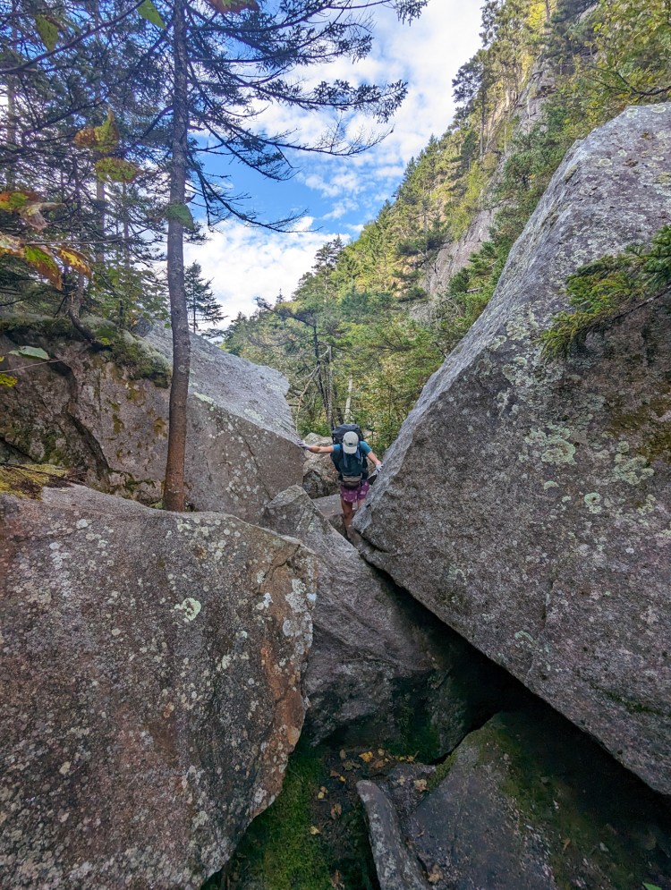 Mahoosic Notch is a mile of random, fridge-to-car-sized boulders, where you have to scramble over and under and through. Took us about two hours and twenty minutes for about 0.9 miles. Was fun at times, and we had dry conditions, which was very welcome.
