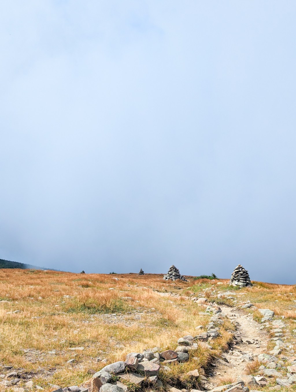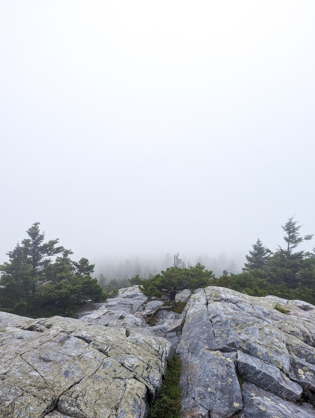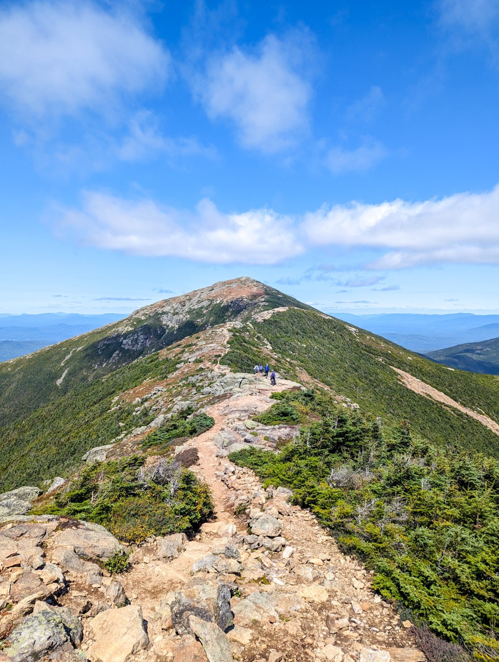 Did South and North Kinsman today as an ‘easy’ 16 mile slackpack. Started at 6:50 at Kinsman Notch in the fog. Weather cleared up while doing the Mt Wolf PUDs. Got our feet wet on the bog boards. After that, hiked/scrambled up South Kinsman. Very windy on top, nice views. Then on to North Kinsman,